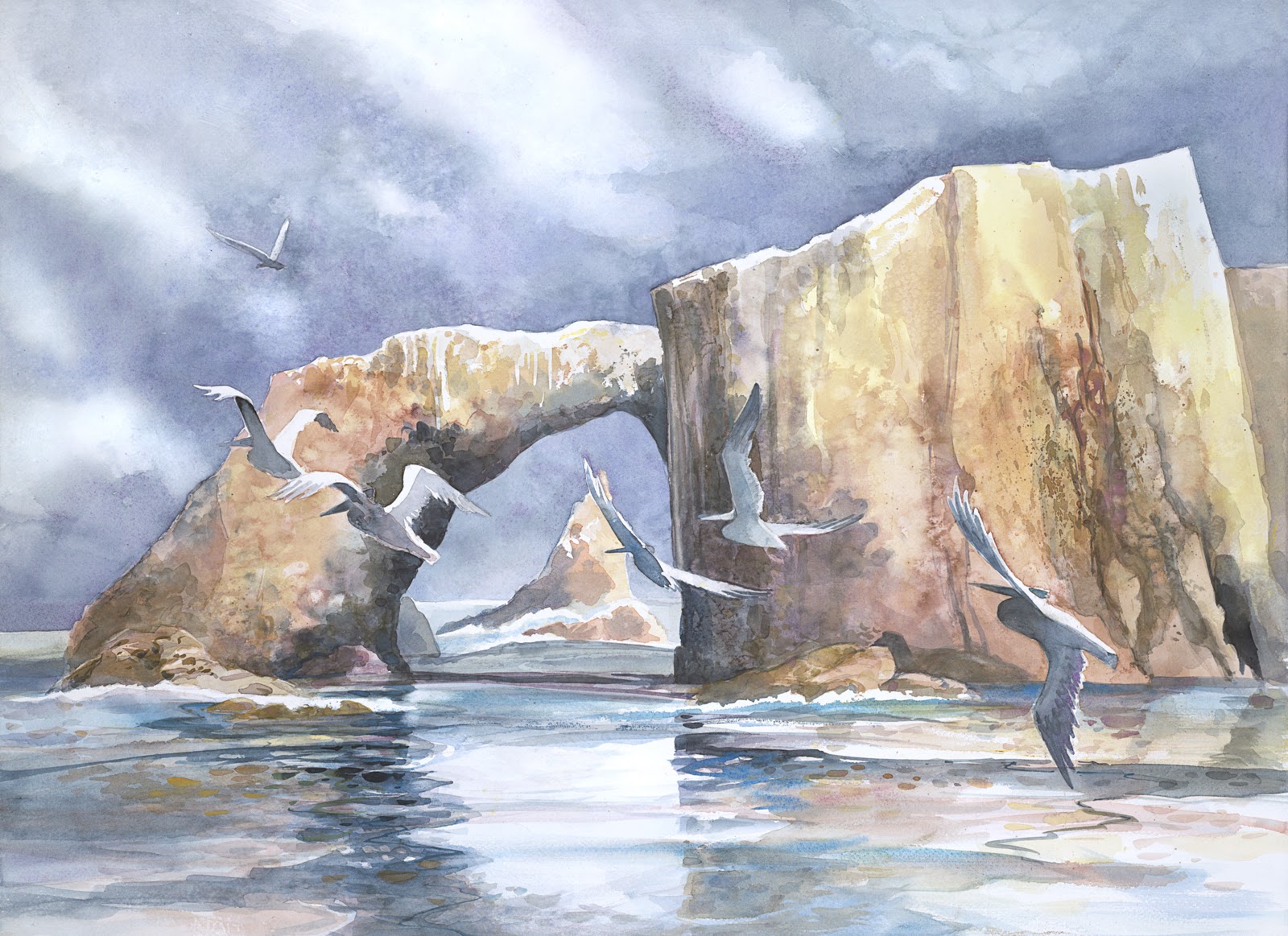 This is the fifth in a series of paintings of the Anacapa Arch, which explore the various moods and views of majestic sculpted rock with its changing light and resident birds.