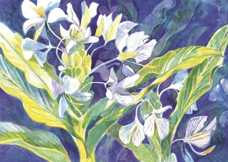 Ginger blossoms in a spiral sequence out of the pod, each blossom emerging and fading rapidly. I had to work fast, getting the rhythm and details simultaneously, finishing the painting essentials at one sitting. Linear pastel additions enhanced the energy.
